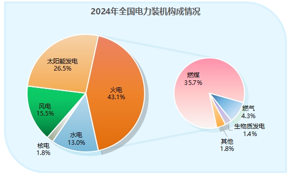 最新電力數據顯示:截至2024年底,全國發電裝機容量33.5億千瓦,同比增長14.6%。分類型看,水電4.4億千瓦(含抽水蓄能5869萬千瓦),占全部裝機容量的13.0%;火電14.4億千瓦(含煤電11.9億千瓦、氣電1.4億千瓦),占全部裝機容量的43.1%;核電6083萬千瓦,占全部裝機容量的1.8%;并網風電5.2億千瓦,占全部裝機容量的15.5%;并網太陽能發電8.9億千瓦,占全部裝機容量的26.5%。