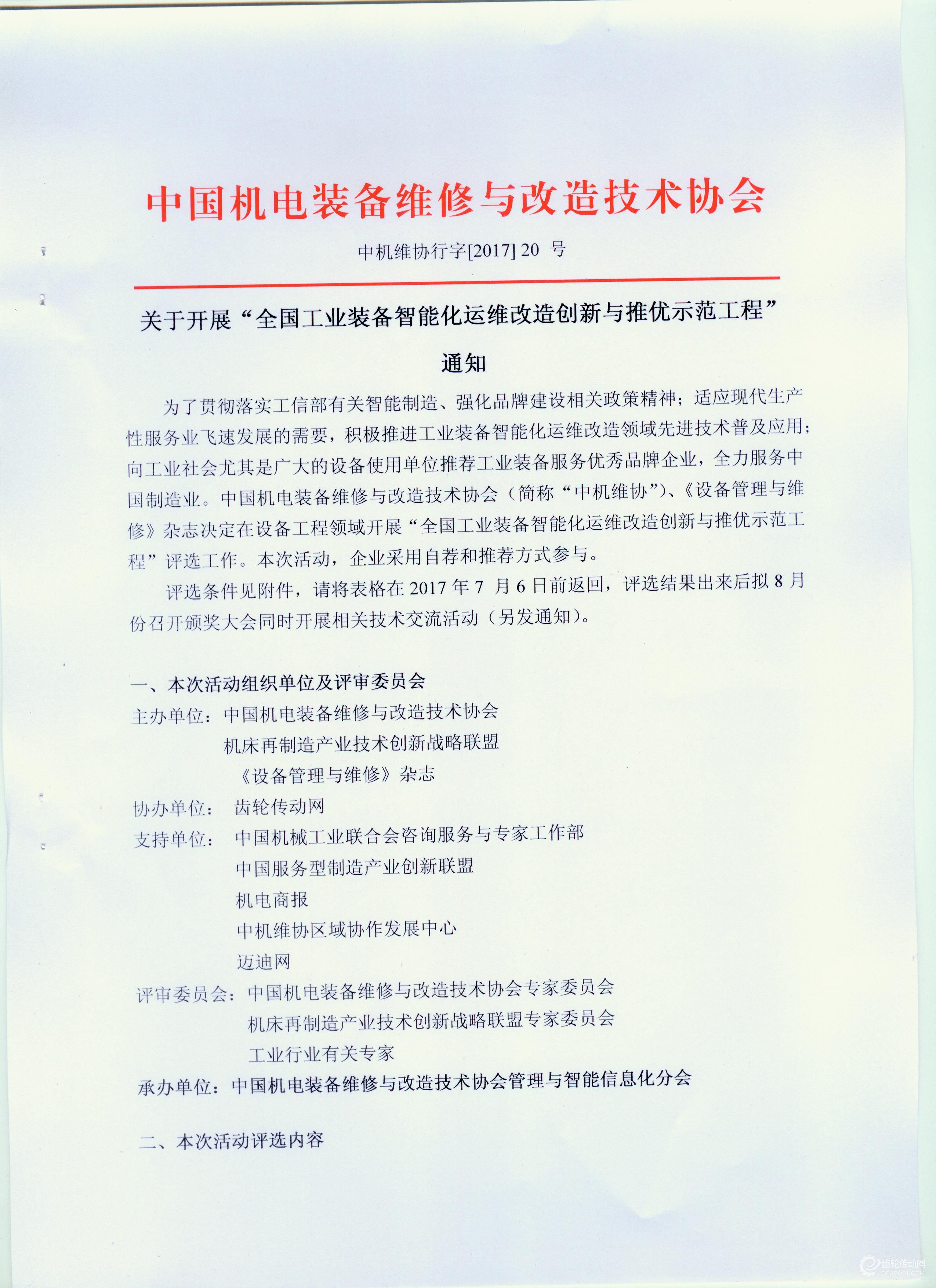 為了貫徹落實工信部有關智能制造、強化品牌建設相關政策精神;適應現代生產性服務煊飛速發展的需要,積極推進工業裝備智能化運維改造領域先進技術普及應用;向工業社會尤其是廣大的設備使用單位推薦工業裝備服務優秀品牌企業,全力服務中國制造業。中國機電裝備維修與改造技術協會(簡稱“中機維協”)決定在設備工程領域開展“全國工業裝備智能化運維改造創新與推優示范工程”評選工作。本次活動,企業采用自薦和推薦方式參與。