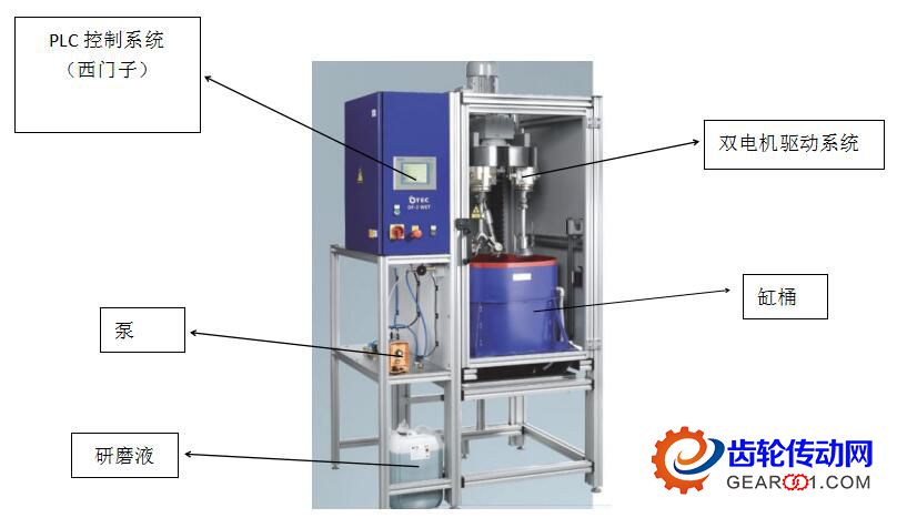 加工時齒輪沉入磨料內,在裝有磨料的缸筒內做環狀運動,通過與磨料顆粒的互相摩擦起到互相研磨和拋光的作用。粗研+精研+拋光的全過程齒輪只需一次裝夾,分三次更換缸桶,用裝有不同的磨料分別進行粗、精研磨和拋光。缸桶及磨料不轉,通過控制系統控制雙電機驅動系統實現齒輪的正、反轉,帶動和實現齒輪在磨料缸桶內旋轉,以實現齒輪的研磨和拋光。