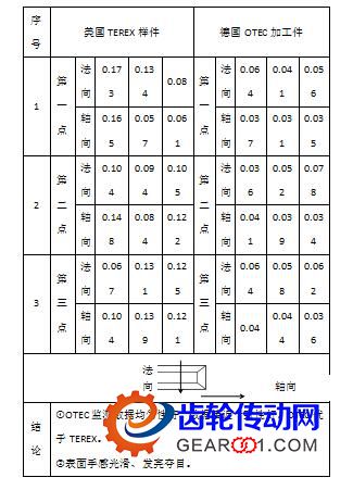 將OTEC超精加工的齒輪見圖6圖7所示和美國原廠的樣件一起在德國mahr表面粗糙度檢測儀上檢測,其檢測的數據列表如下: