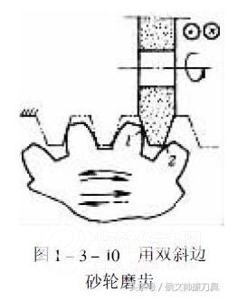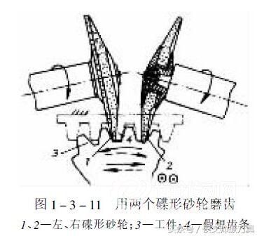 用兩個碟形砂輪磨齒(圖1-3-11)時,兩個砂輪傾斜一定角度,其端面構成假想齒條兩個(或一個)齒的兩個齒面,同時對輪齒進行磨削。其加工原理與用雙斜邊砂輪磨齒完全相同,所不同的是用兩個砂輪同時磨削一個齒間的兩個齒面或兩個不同齒間的左右齒面。此外,為了磨出全齒寬而必須的軸向往復運動,是由工件來完成的。