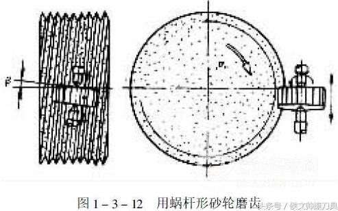 為了提高磨齒的生產效率,可以采用蝸桿形砂輪磨齒(圖1-3-12),其加工原理與滾齒類似。由于連續分度以及很高的砂輪轉速,所以生產率很高。但是,蝸桿形砂輪的修整很困難,故目前應用尚少。