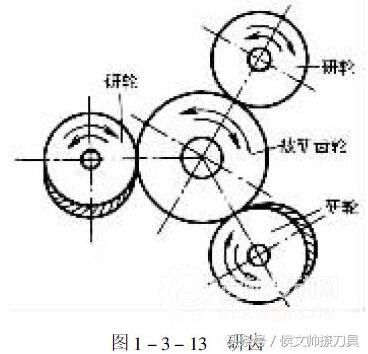 圖1-3-13為研齒的加工示意圖,被研齒輪安裝在三個研磨輪之間,同時與三個研磨輪嚙合。研磨直齒圓柱齒輪時,三個研磨輪中,一個是直齒圓柱齒輪,另兩個是斜齒圓柱齒輪。研齒時,工件帶動被制動的研磨輪旋轉,為了在全齒寬上研磨齒面,工件沿軸向作快速往復運動。研磨一定時間后,改變旋轉方向,研磨另一齒面。