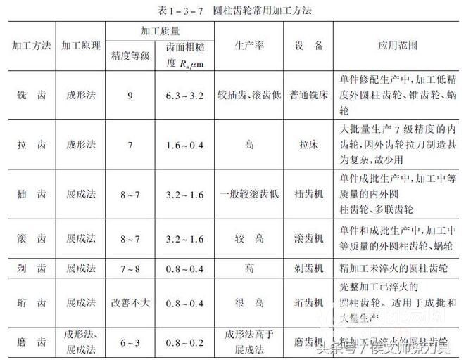 齒輪齒形加工方法的選擇,主要取決于齒輪精度和齒面粗糙度的要求以及齒輪的結構、形狀、尺寸、材料和熱處理狀態等。表1-3-7所列出的9~4精度圓柱齒輪常用的最終加工方法,可作為選擇齒形加工方法的依據和參考。